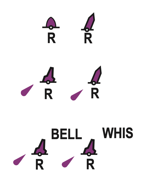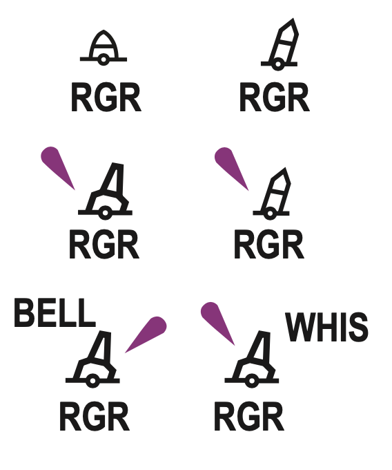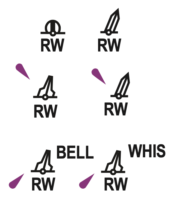 ![]() RW: Red et White Whis: Whistle. Goutte mauve: bouée munie d’un feux. | Rouge et blanc, organisées en bandes verticales. | Une seule sphère rouge (optionnel). | ![]() – Éclats blancs. – Lettre morse « A » (Mo(A)): éclat court suivi d’un éclat long. – À toutes les 6 ou 10 secondes. | On la traite comme un rond point. On la laisse sur notre bâbord. |