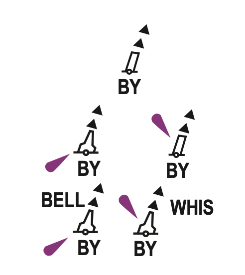 ![]() Bu: Blue Y: Yellow Al.Oc.: Alternance, Occultée. Goutte mauve: bouée munie d’un feux. | Bandes verticales bleues et jaunes. | Une croix. | ![]() – Bleue et jaune en alternance. – Occultée: plus souvent éclairée que sombre. – Aux trois secondes. | On peut la traiter comme un rond-point, mais il faut l’éviter! Voir le paragraphe ci-dessous. |