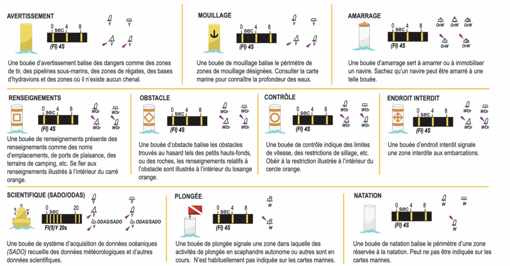 Elles sont soit jaunes, soit blanches, ou blanches avec des inscriptions oranges. De nuit, elles ont presque toutes la même apparence, soit un éclat jaune aux quatre secondes. La seule exception est la bouée SADO/ODAS, qu’on retrouve plus au large, qui clignote d’un éclat aux cinq secondes. À défaut de faire face à cette dernière (très impressionnante), il faut aller voir sa carte pour distinguer les autres, ou encore l’éclairer à lampe torche.