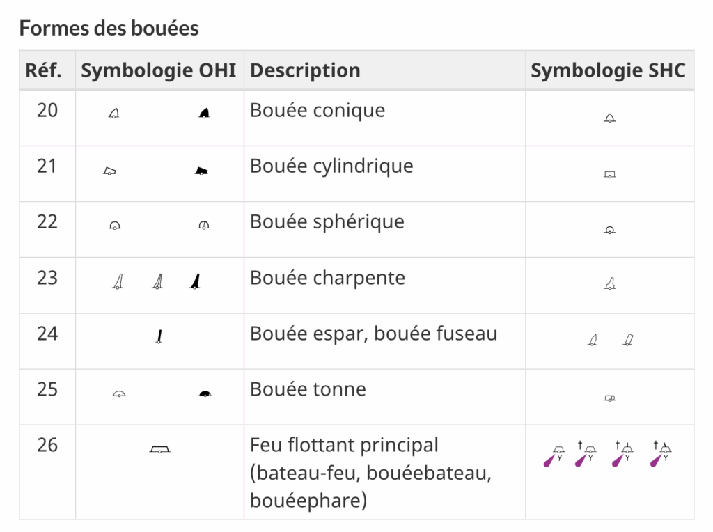 Les bouées peuvent prendre plusieurs formes. Les plus fréquentes sont les charpentes, les espars et les cylindres. Ici, une image vaut mille mots.