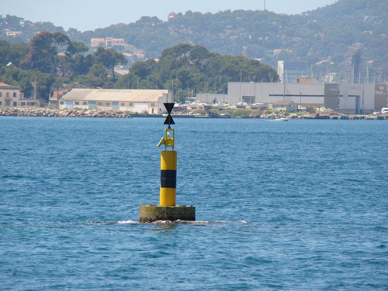 ![]() B: Black Y: Yellow Whis: Whistle Goutte mauve: bouée munie d’un feux. | Trois bandes horizontales, en partant du haut: jaune, jaune et noir. | Deux cônes superposés, les deux étant inversés (Apparence de triangles qui pointent vers le bas). | ![]() – Blanche – 6 éclats très rapides suivi d’un long éclat aux 5 secondes ou six éclats rapides suivi d’un long éclat aux 10 secondes. | On doit aller vers le sud. |