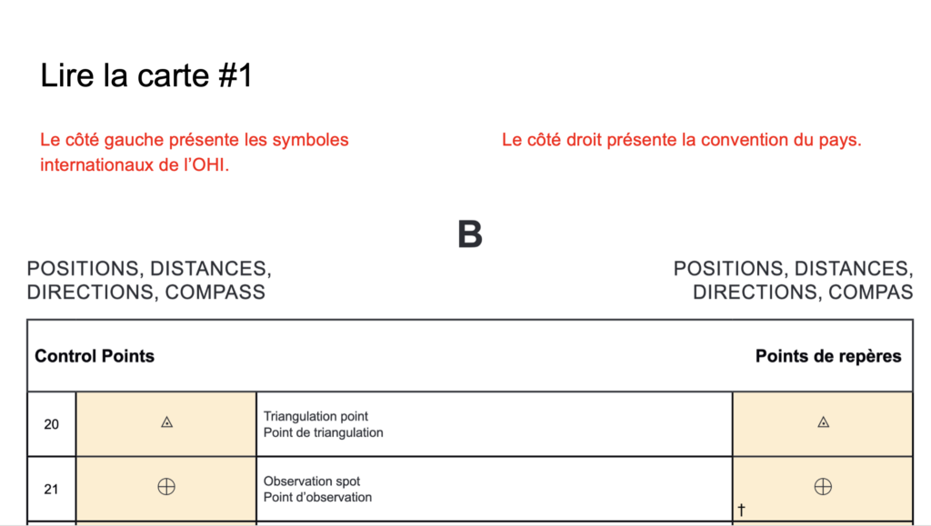 La Carte #1 est organisée de manière à faciliter la comparaison entre les standards internationaux et les pratiques canadiennes. Le côté gauche de chaque page présente les symboles définis par l’OHI, tandis que le côté droit montre leur équivalent canadien. Cette structure permet au navigateur de s’adapter plus facilement à des cartes provenant d’autres pays, dont les conventions sont souvent similaires, mais légèrement différentes.