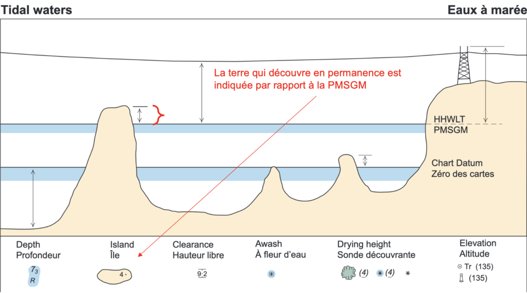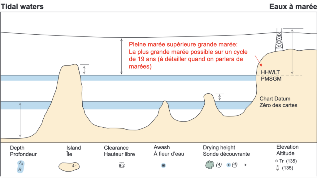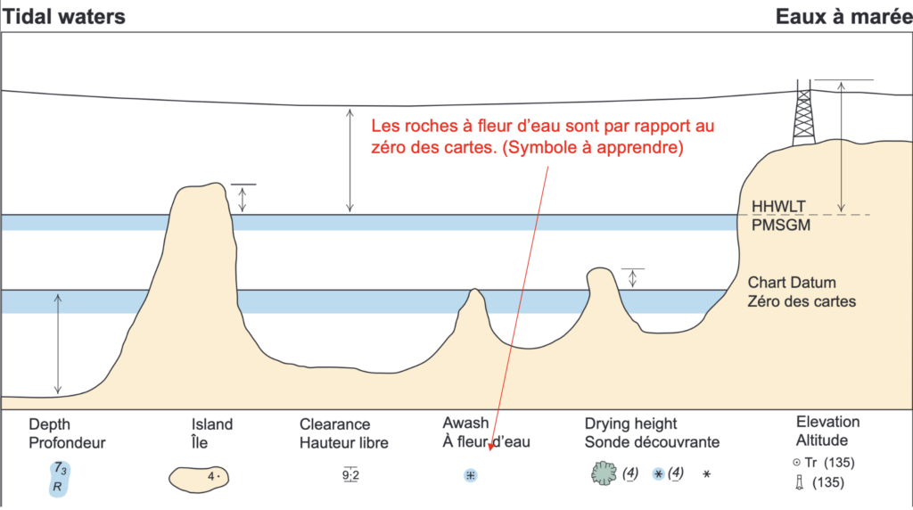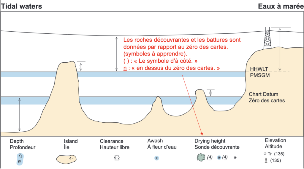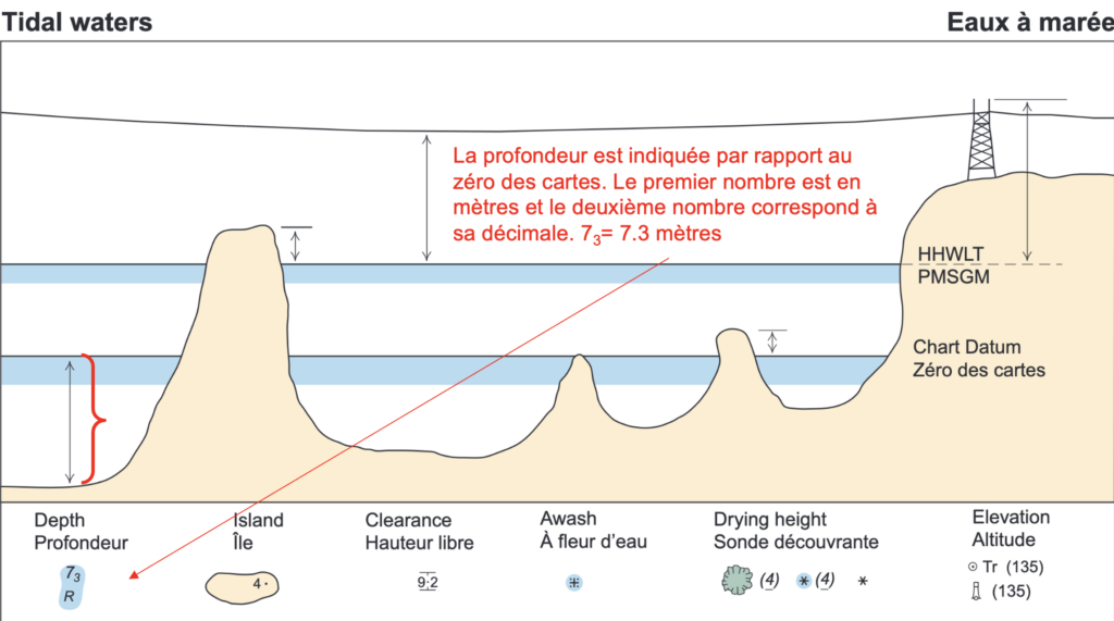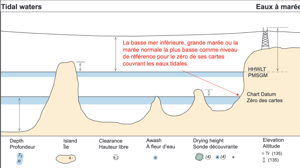 L’un des concepts les plus importants en navigation est celui du zéro des cartes. Comme le niveau de l’eau varie constamment en raison des marées et des conditions saisonnières, il est nécessaire de définir une référence fixe à partir de laquelle toutes les mesures sont prises.