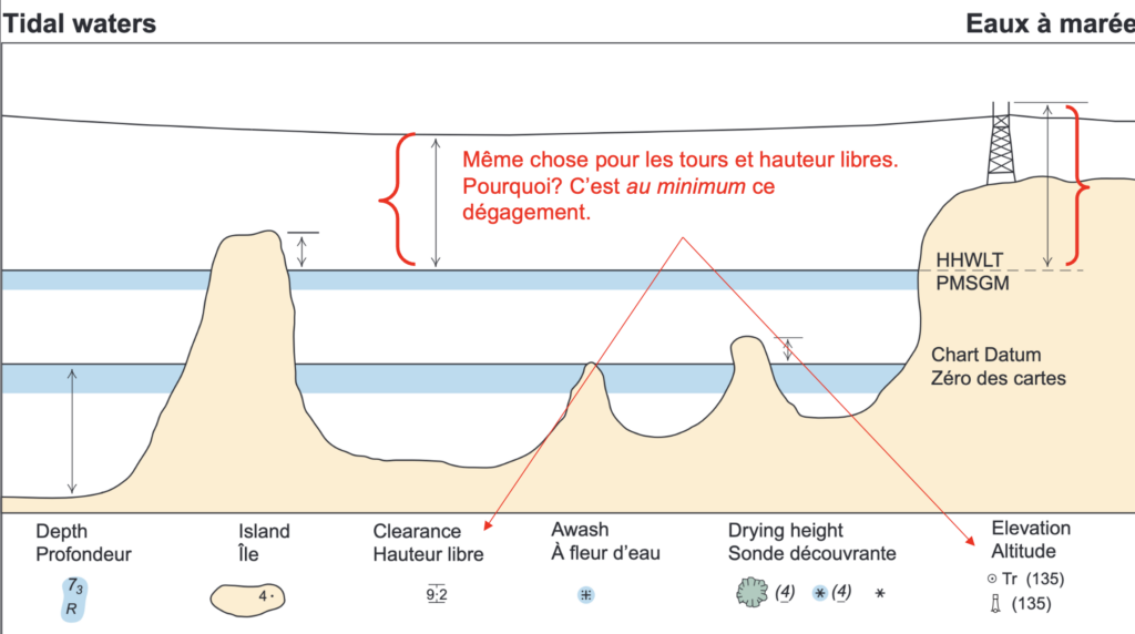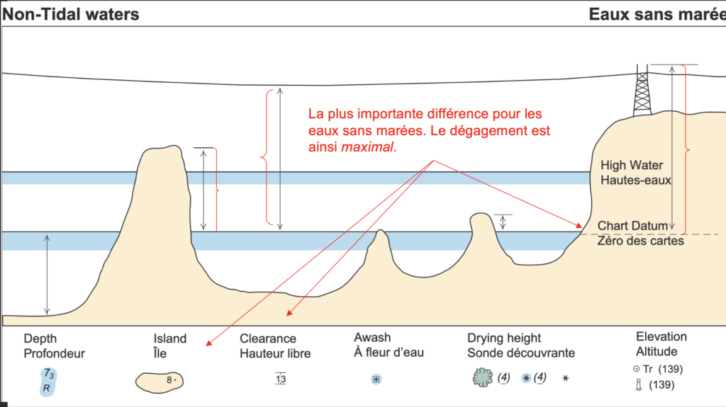 Dans les eaux sans marée, la différence la plus importante est que toutes les sondes et tous les dégagements sont présentés à partir du zéro des cartes. En particulier, les terres en jaune et le dégagement d’air peuvent être inférieurs, car mesurés à partir du zéro des cartes. Cette différence est essentielle à comprendre, car elle change l’interprétation des dégagement d’air.
