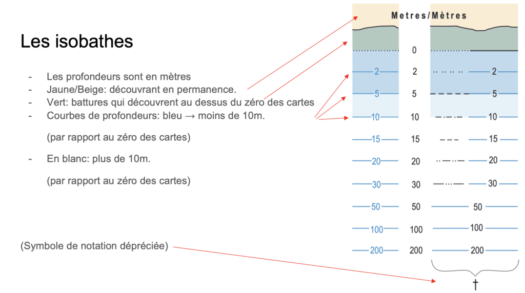 Les isobathes sont des lignes qui relient des points de profondeur égale. Elles permettent de visualiser rapidement la topographie sous-marine et d’identifier les zones dangereuses.