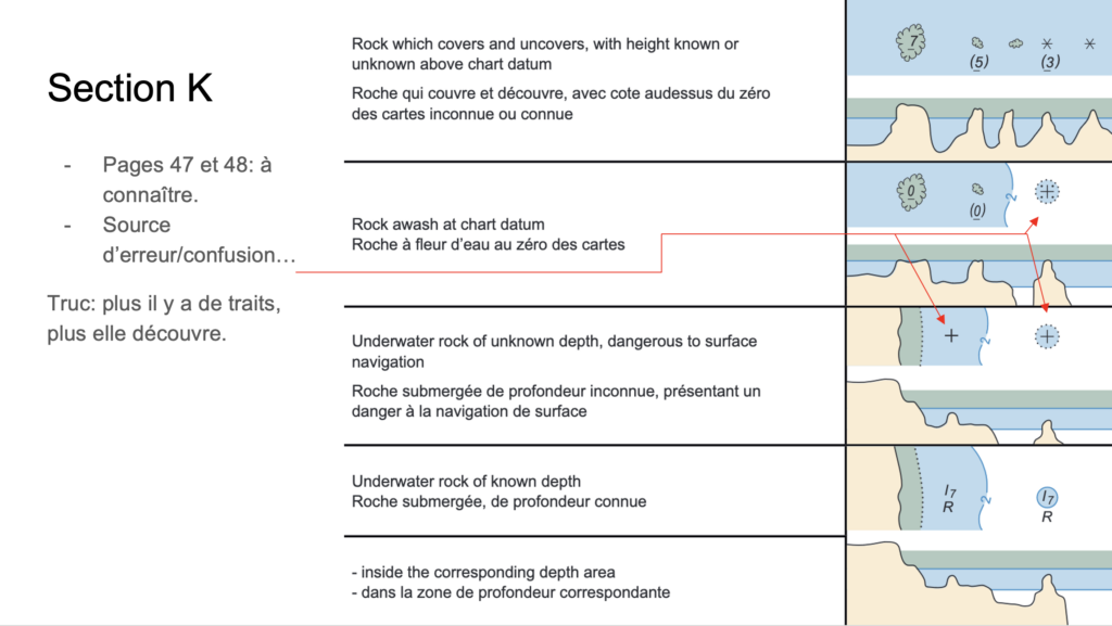 Les cartes marines utilisent une variété de symboles pour représenter les dangers liés au relief sous-marin. Parmi les plus importants figurent les roches à fleur d’eau, les roches découvrantes et les battures.