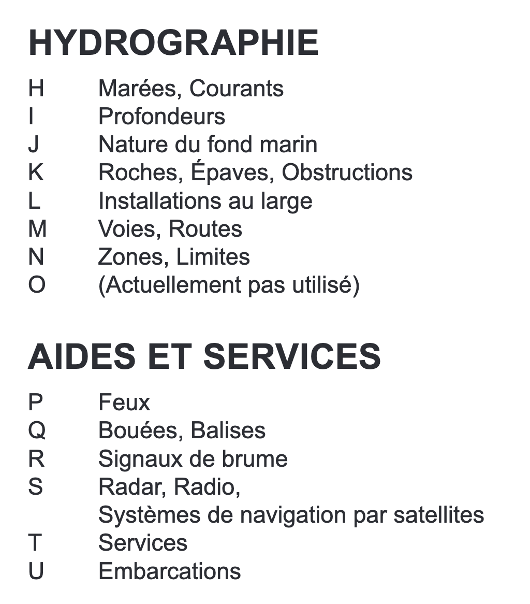 Les symboles sont regroupés par thèmes dans différentes sections identifiées par des lettres. Pour un navigateur débutant, certaines sections sont particulièrement importantes, notamment les sections H, I, J, K et Q. Les sections P, R et S deviennent plus pertinentes à un niveau intermédiaire. Ce texte du SHC peut aider.