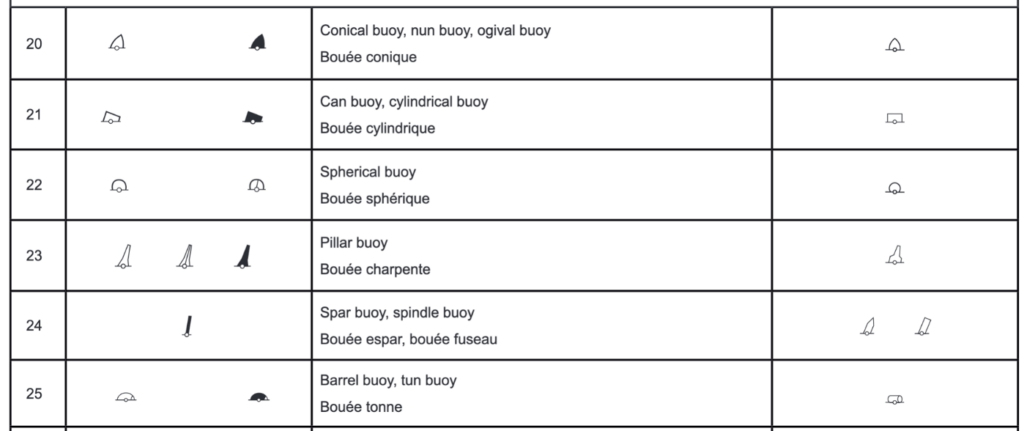 Finalement, c’est une bonne chose que de pouvoir distinguer la forme des bouées: charpente, cylindrique, ou espar. Les symboles sont résumés