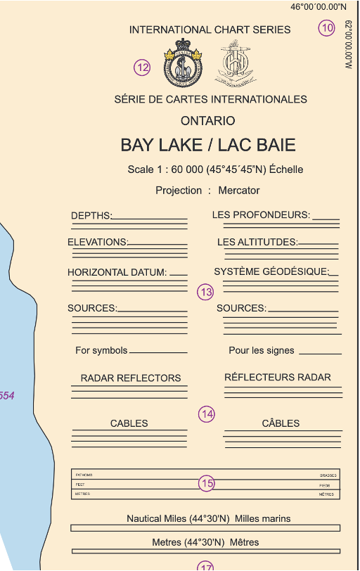 Le bloc titre d’une carte marine contient des informations essentielles. Il précise notamment le nom de la région couverte, l’échelle de la carte, le type de projection utilisé et les références liées au zéro des cartes.