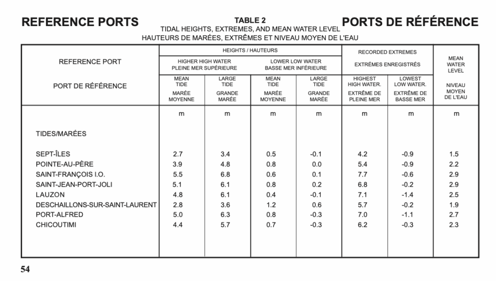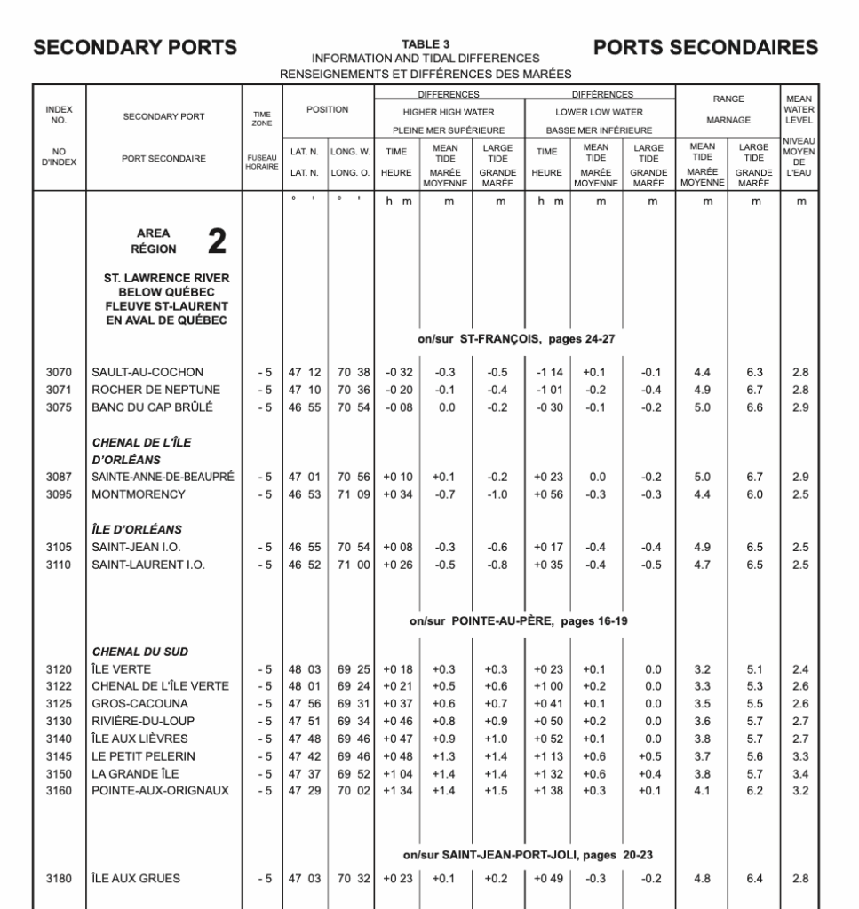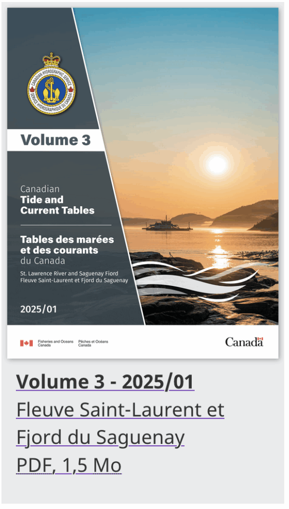 Pêches et Oceans Canada (2024). Tables des marées et des courants (Volume 3), document récupéré en ligne en mars 2025 à partir de cette adresse.