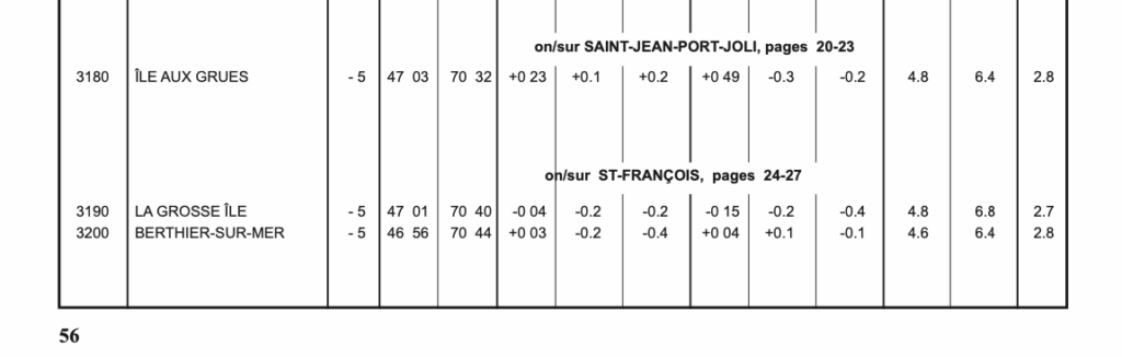 Il faut de nouveau consulter la table des marées. Cependant, l’Île aux Grues n’a pas de table des marées spécifique. C’est un port secondaire. Pêches et Océans ne présente que des corrections à apporter par rapport à un port de référence. Pour obtenir les niveaux de marée, il faut ainsi: