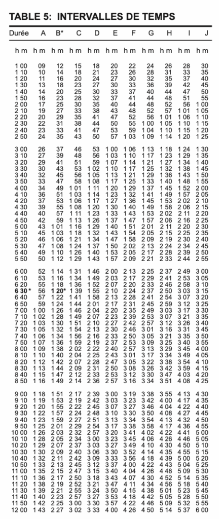 Une fois que cette répartition est comprise, il suffit de se faire un tableau pour faire les calculs et ajouter les variations. Ci-dessous, le tableau permet de calculer le niveau de l’eau à Saint-Jean-Port-Joli après la marée basse. En regardant le tableau de la solution à la technique #5, on peut identifier un marnage de 2.8 mètres entre la marée basse du matin et la marée haute de l’après-midi.