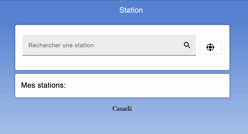 L’application fédérale des marées est disponible à cette adresse. Il faut choisir sa langue d’usage et ensuite rechercher une « station » (image de gauche, ci-dessous). Au besoin, on peut cliquer sur l’icône de globe-terrestre pour identifier une des stations disponibles (image de droite, ci-dessous). On y trouvera notamment la station de Saint-Jean-Port-Joli. On peut ainsi la choisir.