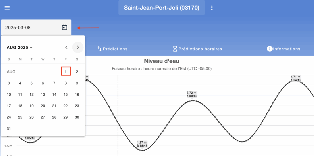 Une fois qu’on a choisi la station qui nous intéresse (ci-dessous, Saint-Jean-Port-Joli), il faut alors changer la date pour celle qui nous intéresse (ici, le premier août 2025).