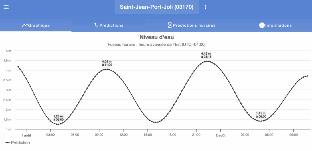 Avant de lire les marées, on portera attention au fuseau horaire utilisé par l’application. Normalement, l’application indique automatiquement l’heure d’été (l’heure avancée de l’est, UTC-4) pendant la période estivale. Sinon, elle affichera l’heure normale de l’est (UTC -5) et on voudra additionner une heure pour obtenir l’heure d’été. Dans l’image ci-dessous, les marées sont indiquées à l’heure d’été, ce qui correspond directement aux heures qu’on emploie normalement pour faire nos planifications estivales.