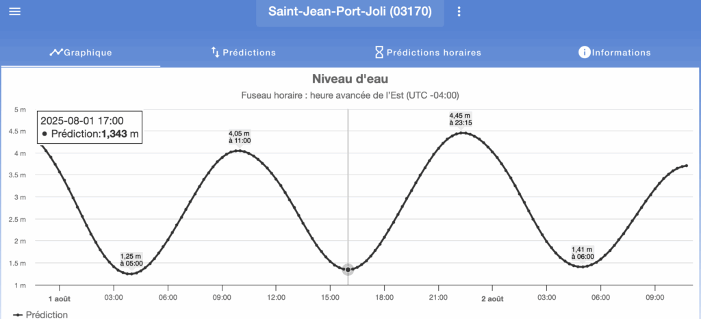 L’application nous donne alors les valeurs de la marée en tout temps sous forme de graphique. Elle affiche également les données de marée haute et de marée basse. La première marée basse est à 05h00 (heure d’été), la marée première marée haute de la journée est à 11h00 (heure d’été).
