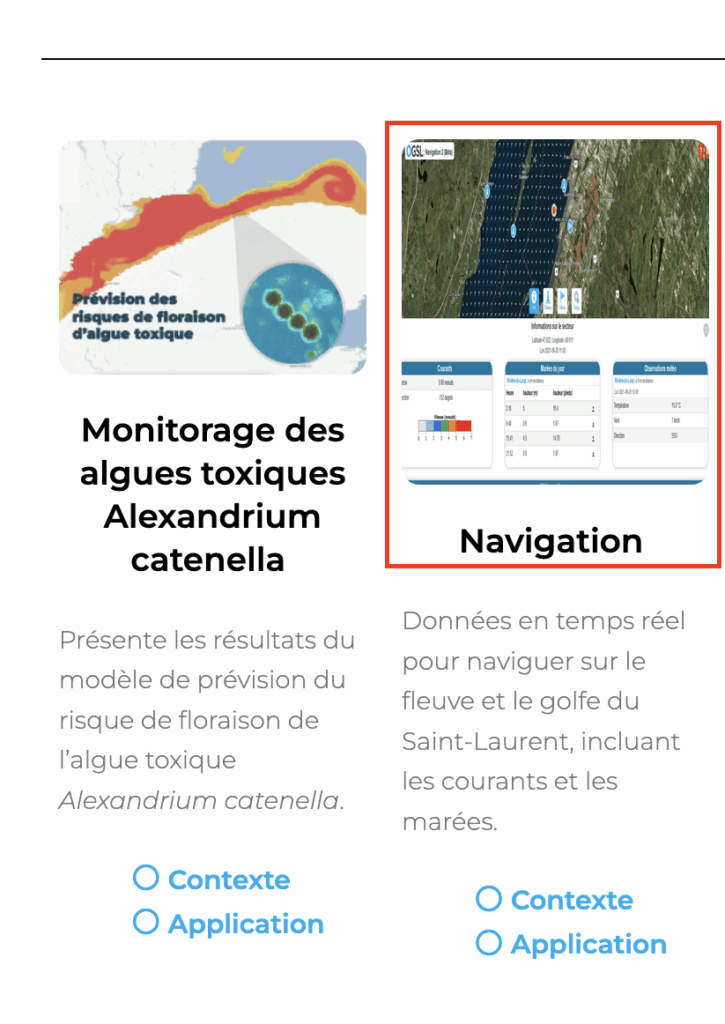 À partir de la page d’accueil de l’Observatoire global du St-Laurent (ci-dessous, à gauche), il faut cliquer sur la page « Outils de navigation » et ensuite l’onglet « navigation » (ci-dessous, à droite). On y trouvera alors une foule d’information utile à la navigation sur le fleuve. Dans le cadre de ce texte, l’information qui nous intéresse traite des marées.
