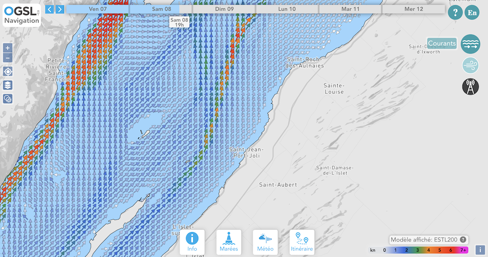 Une fois dans l’onglet de navigation, l’outil présentera les courants de marée par défaut (image ci-dessous). On trouvera cependant un bouton « marées » en bas de l’écran. Il faut alors cliquer dessus. On vous demandera alors de choisir un endroit sur la carte pour ensuite identifier une station de marée (les données étant les mêmes, ce sont les mêmes que celles de Pêches et Océans Canada). Dans notre cas, on choisira « Saint-Jean-Port-Joli ».