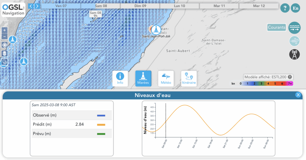 La quatrième technique explore l’Observatoire global du St-Laurent. Elle est quant à elle similaire à l’application fédérale: gratuite et accessible à quiconque muni d’un navigateur. Elle offre beaucoup d’information sur les courants, les vents et les marées. En revanche, il n’est pas possible d’obtenir les données de marées plus qu’une semaine à l’avance.