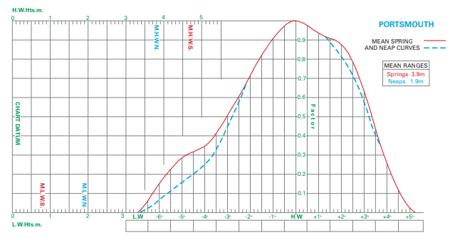 L’idée des tables des marées de Reeds (un fournisseur anglais populaire) est de fournir un graphique typique de le courbe de marée de la région. Ce graphique doit ensuite être calibré en fonction du marnage et de la durée du cycle de marée (comme on le fait avec les tables 5 et 5A de Transport Canada). Une fois calibré, on peut interroger le graphique pour déduire les informations requises pour notre fenêtre de marées. Ci-dessous, je présente une image d’un graphique type pour la ville de Portsmouth.
