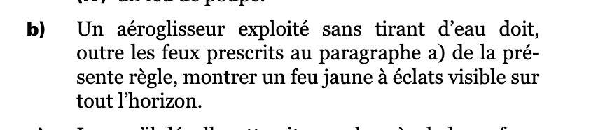 Cela dit, deux éléments devraient suggérer que ce n’est pas ce type de navire. D’abord, le RIPAM précise qu’un feux jaune à éclat bat à raison de 120 battements par minute (contrairement à 90). Ensuite, si on voyait la situation décrite en pratique, on verrait un navire qui se déplace beaucoup plus lentement qu’un aéroglisseur. Et surtout, il serait beaucoup plus long.