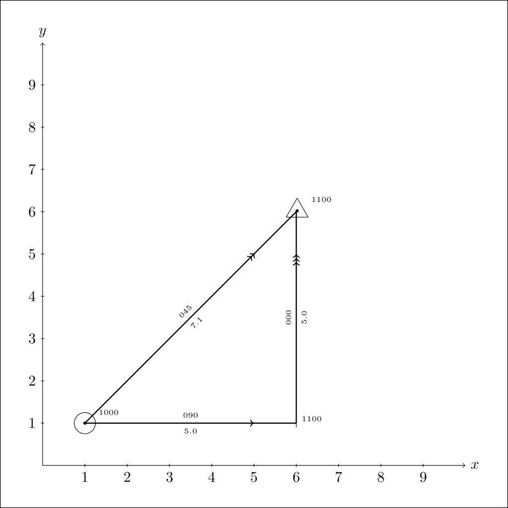 figure.print_file('example-1.png', dpi=500)The example above shows a case where all the information is provided manually. The code draws a fix at the starting point (1,1), with the time set at 1000. The course, current and track are defined in the next three following lines. The arguments x and y are the coordinates of the starting point of each vector (and the other arguments should be fairly intuitive). The last two lines generate the image and save it to disk. The option draw_dr lets the user choose whether a dead reckoning mark should be drawn or not. Although not shown in this example, it is possible to add dead reckoning marks at specific moments, so one may decide to enter them manually rather than to use the option while producing the figure.