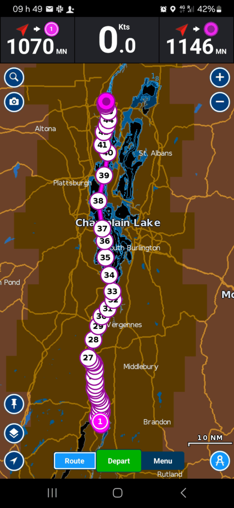 Dans ce texte, j’omets la présentation des tracés de navigation pour fin de brévité, mais ça ressemble essentiellement aux autres segments: navigation de bouée en bouée, à vue. Nous serons dans le Canal Champlain, ce qui signifie que la gestion du trafic sera aussi une composante essentielle de la navigation: passages « rouge sur rouge ».