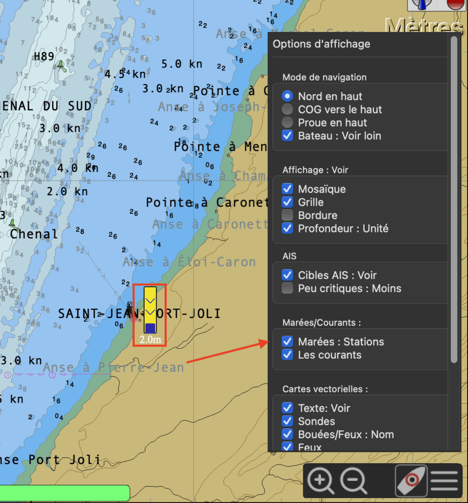 Du moment que les cartes achetées ont des informations sur les courants et sur les marées, OpenCPN les rendra disponibles. Sur OpenCPN, les cartes canadiennes ne comprennent que les information sur les marées.