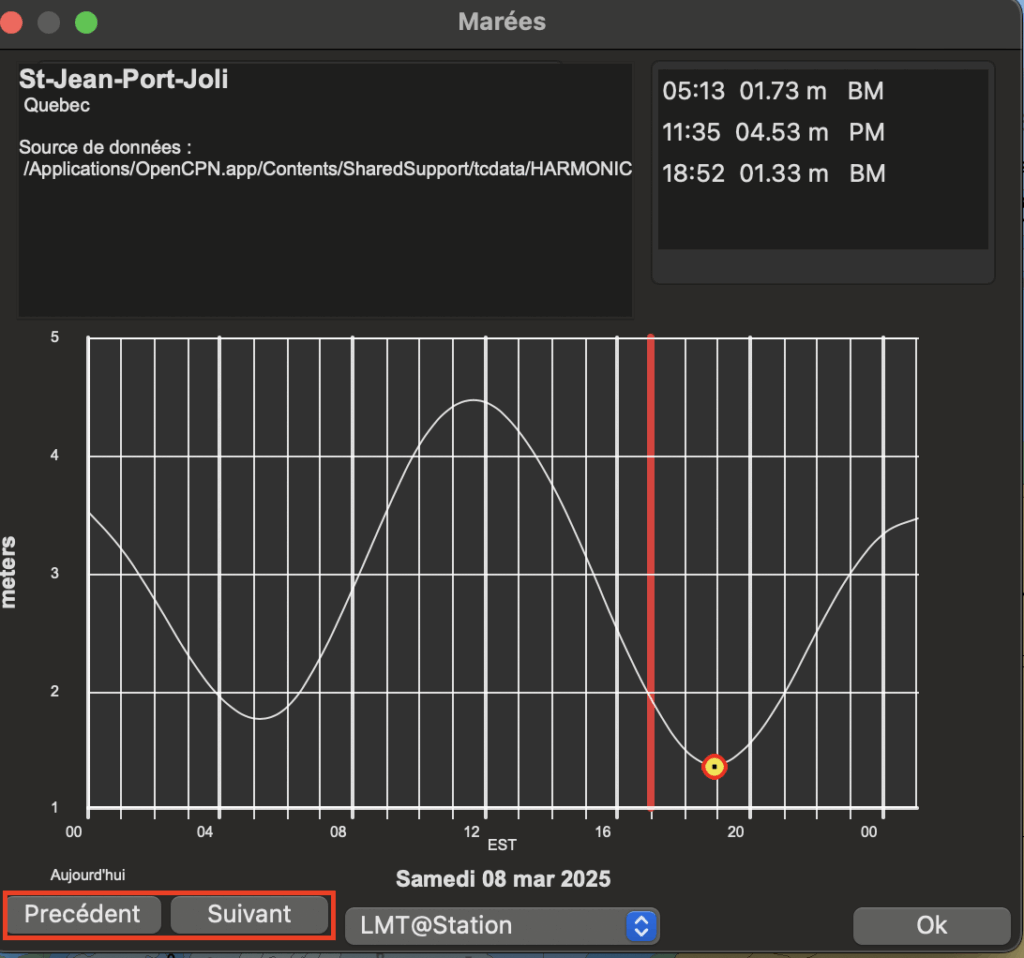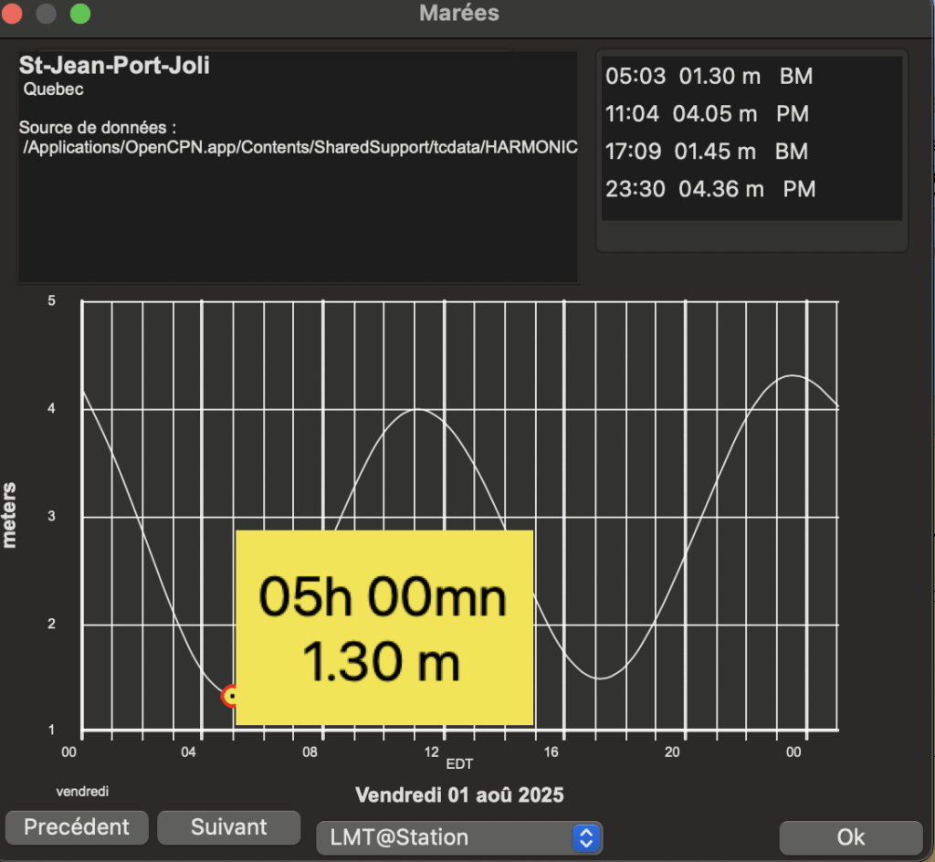 Une fois que les stations sont affichées, il faut faire une « clic-droit » sur la station qui nous intéresse (ici, Saint-Jean-Port-Joli) pour afficher la fenêtre contextuelle des marées. Le logiciel est passablement capricieux: il faudra peut-être cliquer plus d’une fois. Vous devriez alors être en mesure de voir la fenêtre illustrée à droite. Le look peut changer d’une marque de système d’exploitation à l’autre. L’image ci-dessous est prise d’un Apple. Dans tous les cas, vous devriez reconnaître la courbe sinusoïdale représentant le niveau des marées.