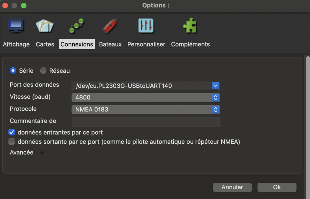 Finalement, il faut configurer OpenCPN pour ajouter une connexion entre le logiciel et le pilote installé. Il faut aller dans le menu « Connexions », puis cliquer sur « ajouter une connexion » avec les spécifications dans l’image ci-dessous. Sur un autre mac, la seule différence notable sera le port de données, qui sera peut-être différente, parce que c’est possible que votre récepteur USB soit connecté à un connecteur différent du miens.