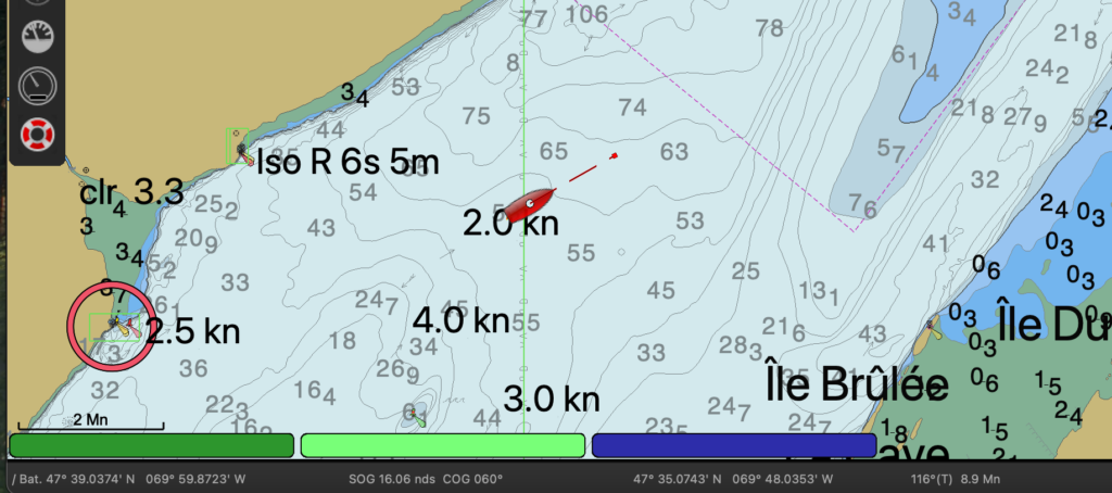 La mesure des angles et des distances passe par l’usage de la touche « m » sur le clavier. Le curseur de la souris devrait alors se transformer en crayon, et il suffit de cliquer à des endroits successifs pour obtenir la distance cumulative et le relèvement, en degrés vrais, de chaque segment. Ci-dessous, j’illustre l’idée d’une route entre Tadoussac et Brandy Pot. On peut y voir une distance approximative de 19.6 milles nautiques (Mn), et le dernier relèvement vers la Baie de Tadoussac est au 347 degrés vrai (° T).