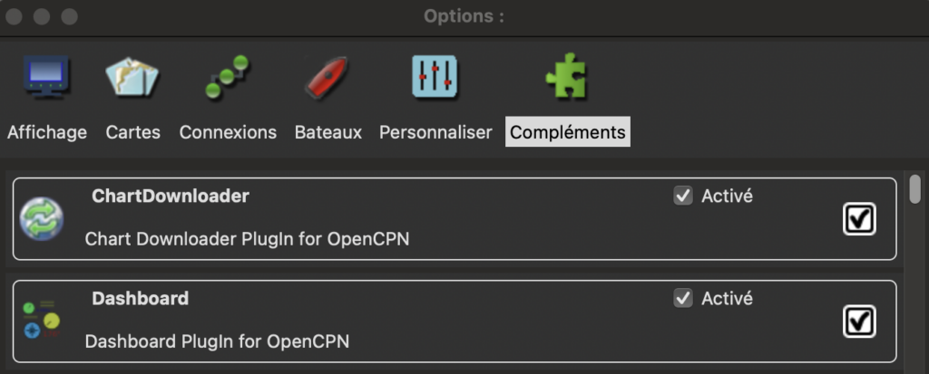 On peut installer les cartes de la NOAA en activant le le module ChartDownloader qui est inclus par défaut avec OpenCPN. (C’est aussi possible de les télécharger manuellement à partir de cette adresse). Pour activer le module, il faut se rendre dans le menu « options » à gauche de l’écran, puis « compléments » et activer le module ChartDownloader. Les images ci-dessous montrent respectivement le menu option et le module activé.