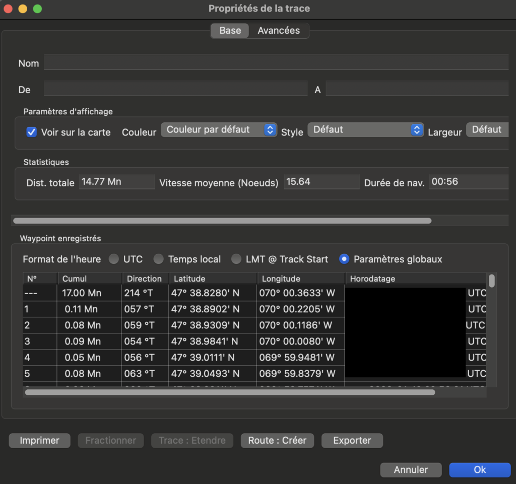 Il est également possible de voir les détails de la trace, ou de lui donner un nom. Pour ce faire, il suffit de double cliquer sur la trace (à l’écran) et ses informations apparaîtront sous forme de tableau. On verra l’ensemble des points de cheminement (waypoints) enregistrés (image ci-dessous). Il est également possible d’accéder aux traces via le menu de gestion de routes (détaillé dans la section précédente).