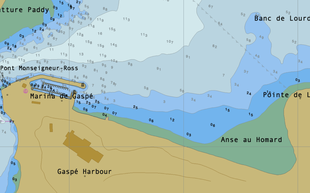 Commentaire de Pier du Sud: nous avons ancré à ce mouillage en attendant que le quai de service de la Marina de Gaspé se libère. Nous y avons vu plusieurs voilier y passer la nuit, notamment pendant que les restes d’une dépression tropicale frappait la Gaspésie. La tenue semble très solide.