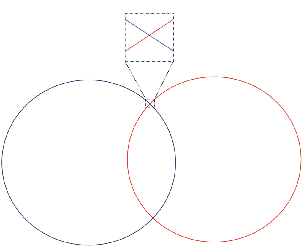 Il nous faut ainsi une technique pour réduire les cercles de position à l’échelle des cartes transportées sur des navires. À cette fin, il convient de noter qu’avec une résolution (zoom) suffisamment grande, tout segment de cercle de position finira par ressembler à une droite. L’image ci-dessous résume l’idée: les deux cercles de position, lorsque ramenés à l’échelle d’une carte, donnent l’impression de deux droites de position (dont l’intersection est bien sûr la position).
