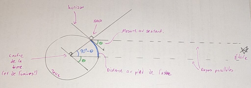 La Figure ci-dessous illustre la notion la plus importante. Sur la droite, on voit l’étoile et les rayons lumineux en sa provenance. Les rayons lumineux sont parallèles. À gauche, on voit la sphère terrestre, et nous sommes à une position quelconque sur la terre. Un sextant permet de mesurer l’écart entre l’horizon et les rayons lumineux de l’étoile. Cet angle est nommé \theta et est en vert dans la figure.