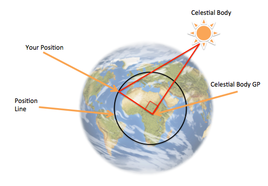 On s’intéresse au pied d’un corps céleste pour établir un cercle de position. Ce faisant, nous sommes intéressés à trouver le pied d’un corps céleste au moment où on fait son relevé au sextant. En pratique, il est crucial que chaque relevé au sextant soit scrupuleusement annoté d’une mesure précise de l’heure (à la seconde près!). Cette heure nous permettra de déterminer à quel endroit est le pied du corps céleste.