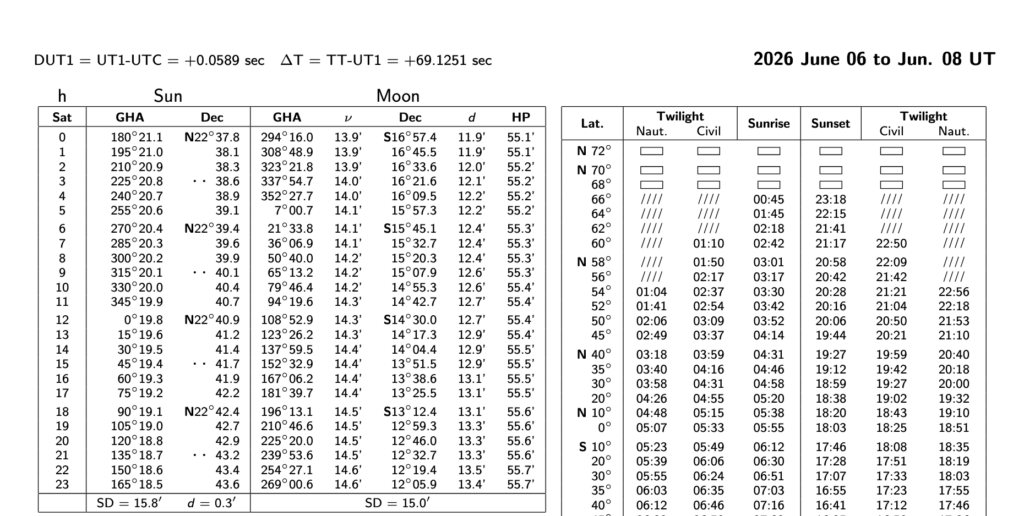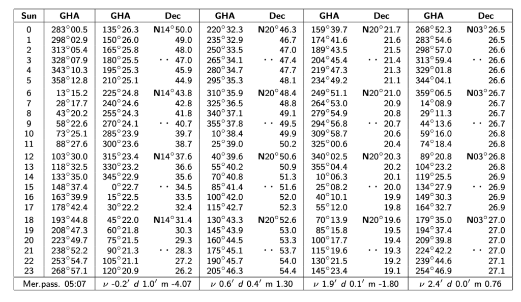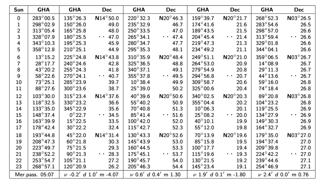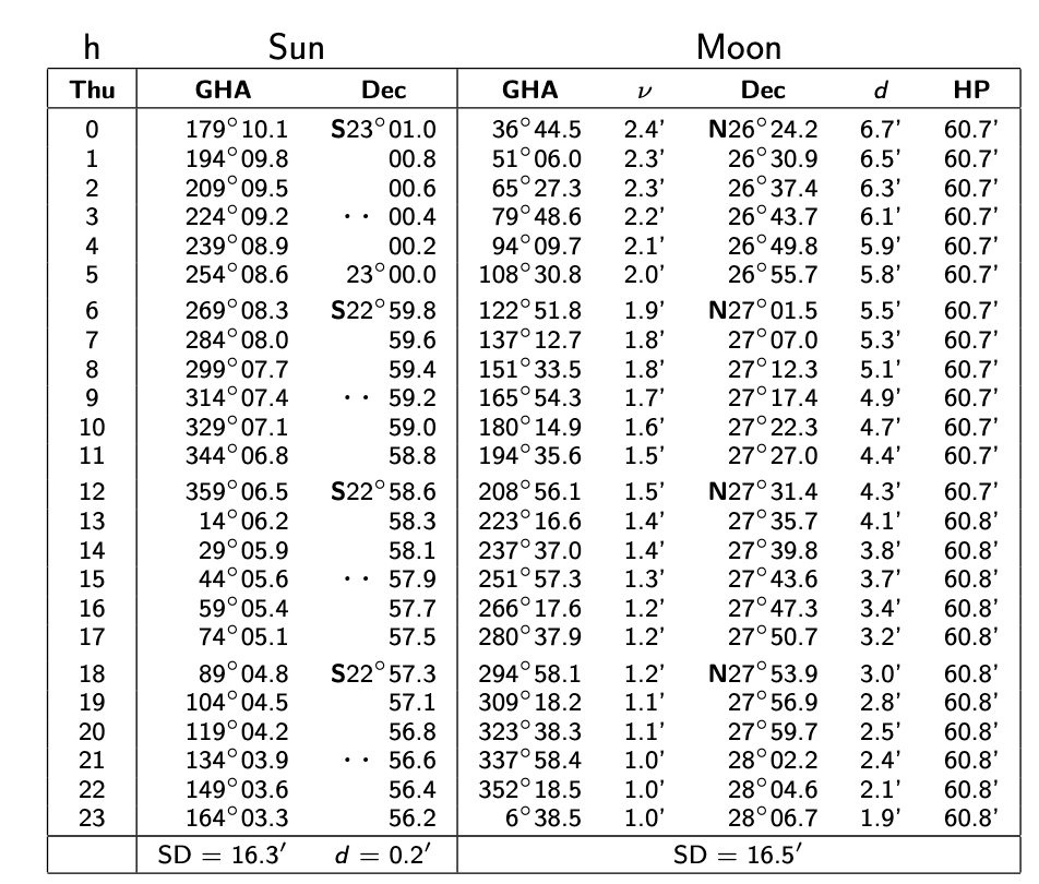 On devrait être capable de déduire que la position du soleil à 0000 (minuit) heure de Greenwich est un GHA de 179° 10.1′ et une déclinaison de S23° 01.0′ (S pour « South»). Cette information est contenue à la première ligne du tableau nommé « Sun », respectivement pour les colonnes « GHA » et « Dec ». Similairement, la position de la lune à 0600 heure de Greenwich est donnée par un GHA de 122° 51.8′ et une déclinaison de N27° 01.5 (N pour « North »).
