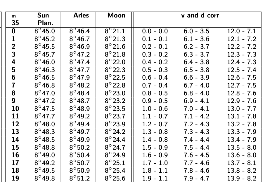 À la fin de l’Almanach (pages 261 et suivantes dans l’édition de 2026), on verra des tableaux intitulés Increments and Corrections (« Corrections et incréments »), qui calculent les interpolations pour nous pour chacun des corps céleste. Dans l’exemple, nous sommes 35 minutes et 6 secondes passé l’heure entière, il faut donc chercher la page associée à 35 minutes, puis lire l’entrée du tableau associée au soleil, associé à la ligne correspondant à 6 secondes. L’extrait pertinent du tableau est reproduite ci-dessous (page 272). Pour le soleil (ou pour une planète), on note ainsi une correction de 8° 46.5′.