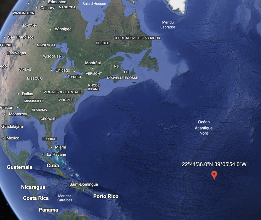 Pour les calculs de navigation astronomique, ce n’est pas la pratique que de convertir ces coordonnées en latitude et longitude, mais pour nous aider à comprendre la correspondance, on peut noter que le GHA est inférieur à 180° et correspond donc à une longitude de 39° 5.9′ W. La déclinaison correspond quant-à-elle à la latitude de 22° 41.6’N. Cette coordonnée correspond à un point quelque part dans l’Atlantique (image ci-dessus). On sait qu’à cette heure, le soleil serait directement au dessus de notre tête.