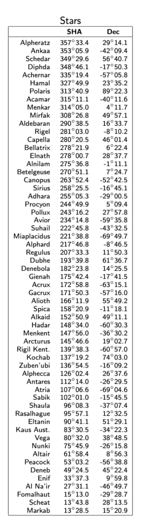 L’angle horaire sidéral (SHA) et la déclinaison de l’étoile sont fournis par l’almanach dans la même page que celle donnant l’information sur le point vernal. Le tableau ci-dessous résume l’information pour les 51 étoiles utiles à la navigation (p. 138 pour l’édition 2026).