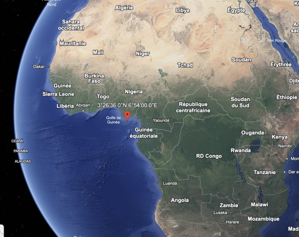 Ce n’est pas nécessaire de le faire pour les calculs usuels de navigation astronomique, mais si on souhaite convertir cette position en longitude et latitude, on peut le faire. Le GHA est de 324° 29.1′ et correspond donc à une longitude à l’est du méridien de Greenwich. Pour la trouver, il faut soustraire le GHA de 360° pour obtenir 6° 54.0′ E. La latitude est bien sûr égale à la déclinaison, soit 03° 26.6’N. Le pied de Saturne est ainsi en quelque part au sud du Nigeria (image ci-dessous).