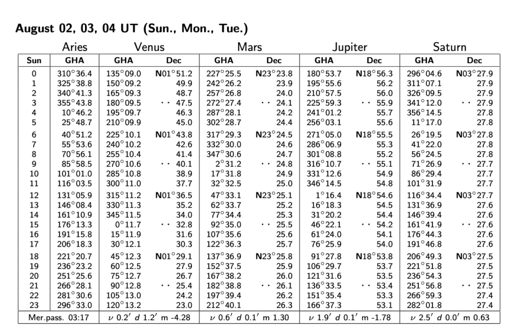 Pour la lune, le soleil et les planètes, les almanachs fournissent directement les coordonnées du pied du corps céleste. Les coordonnées sont fournies en termes d’angle horaire de Greenwich (GHA) et de déclinaison.