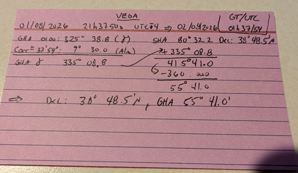 En somme, le pied de Vega est au GHA 55° 40.1′ et à une déclinaison de 38° 48.5′ N.