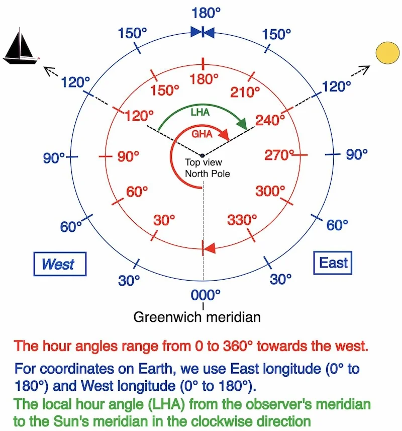 On se rappelle que l’angle horaire de Greenwich (GHA) est équivalent à la longitude, à l’exception près que les angles sont couverts de 0 à 360° en allant vers l’Ouest à partir du meridien de Greenwich. Ainsi, les 180° premiers degrés d’angle horaire de Greenwich sont équivalents au 180° ouest de longitude. Cependant, les degrés 181 et suivants sont équivalents à compter la longitude Est à rebours (image de gauche).